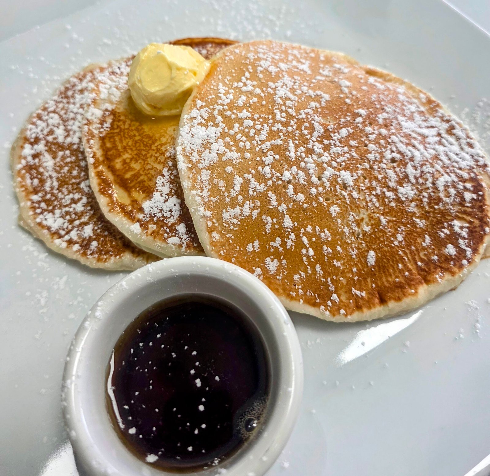 Three buttermilk pancakes with maple syrup, butter and powdered sugar